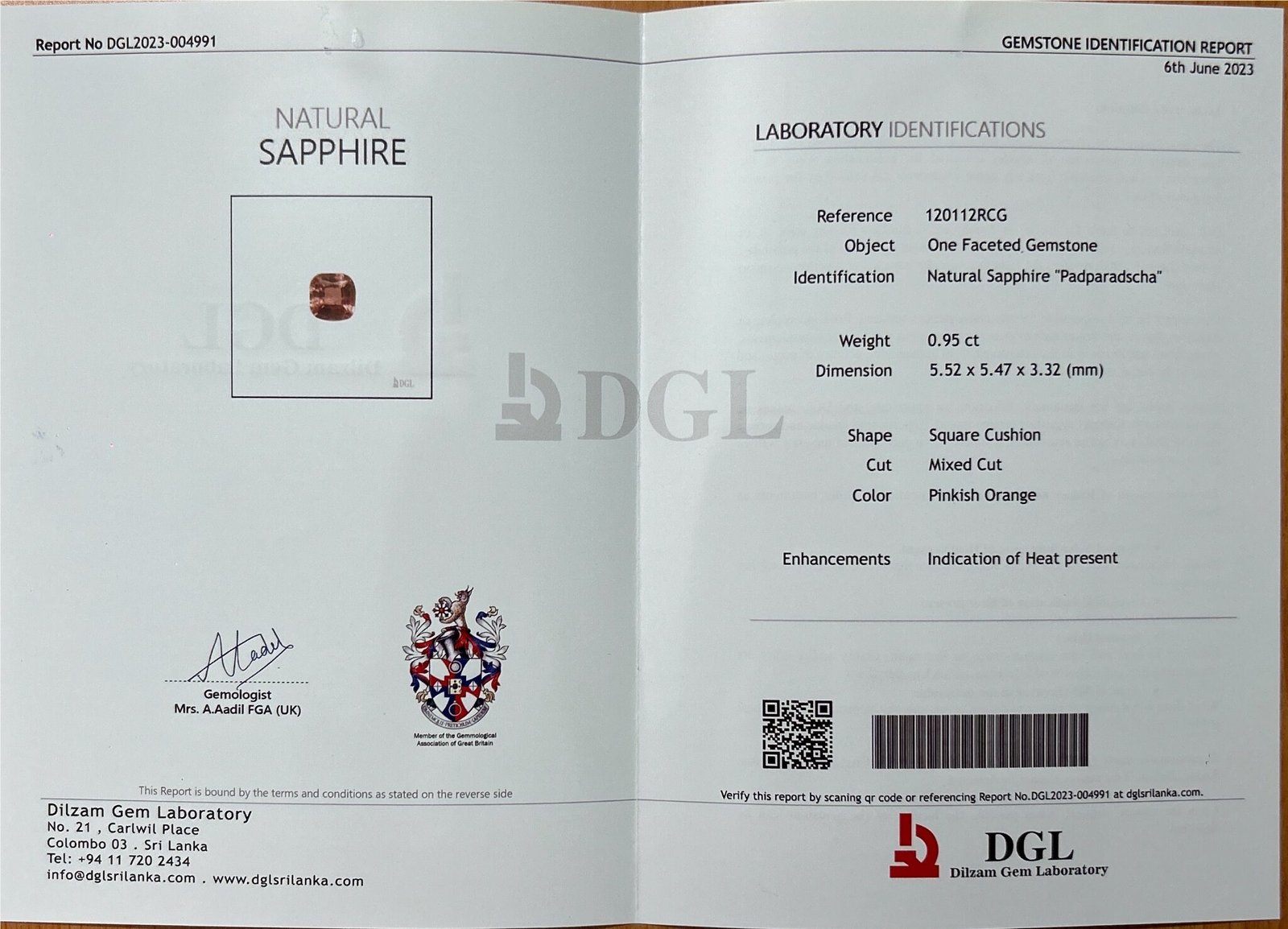 A pretty Padparascha Sapphire of 0.95 carats. Accompanied by a DGL certificate, numbered DGL2023-004991, stating that the Padparadscha Sapphire above is Heated and of PinkishOrange Colour